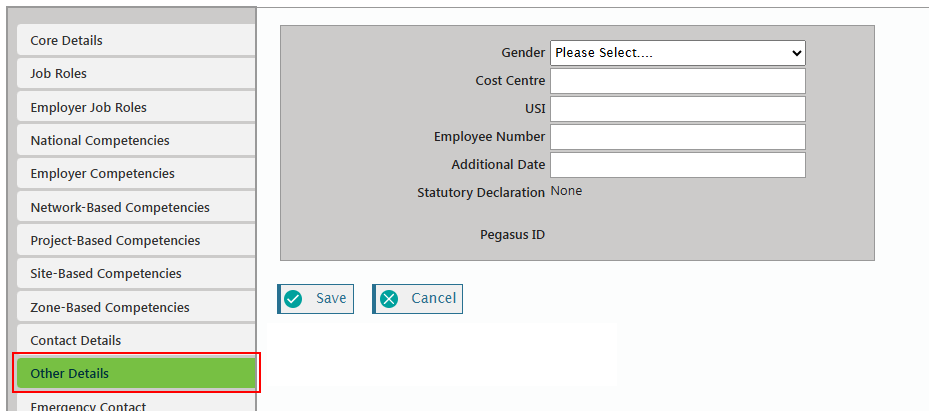 Click on the Other Details tab on the left hand side of the page. Complete the fields as per your company's procedures. Click on the SAVE button when completed.