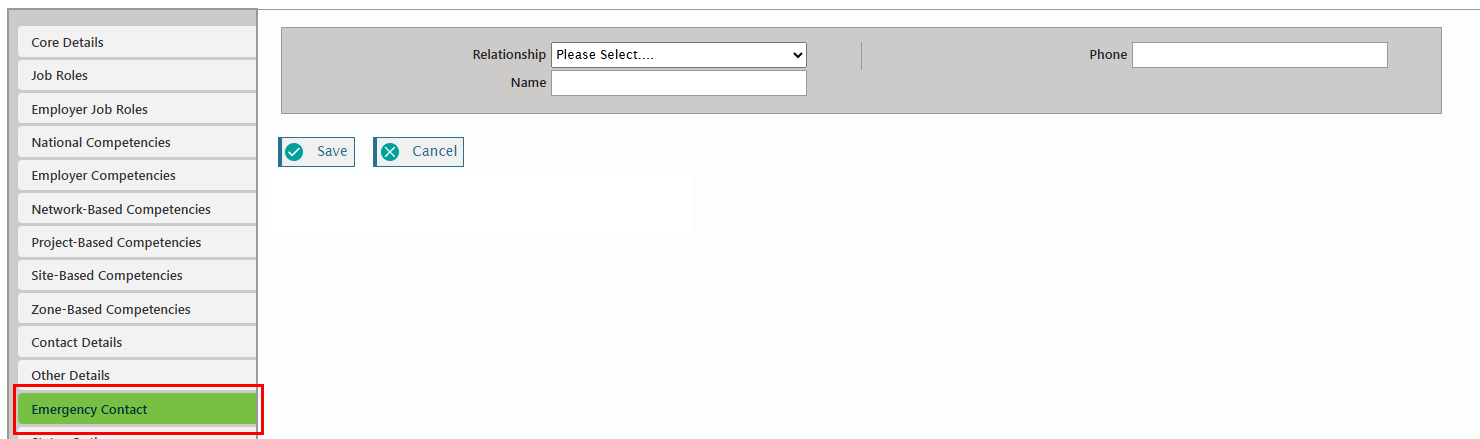 Click on the Emergency Contact tab on the left-hand side of the page. Complete the fields.