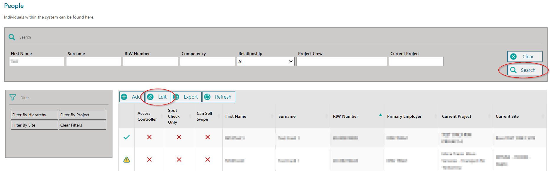 3 | On the People screen, locate the cardholder by filling in the cardholder details to narrow the search. Select the cardholder by highlighting their name and clicking on the Edit button. |