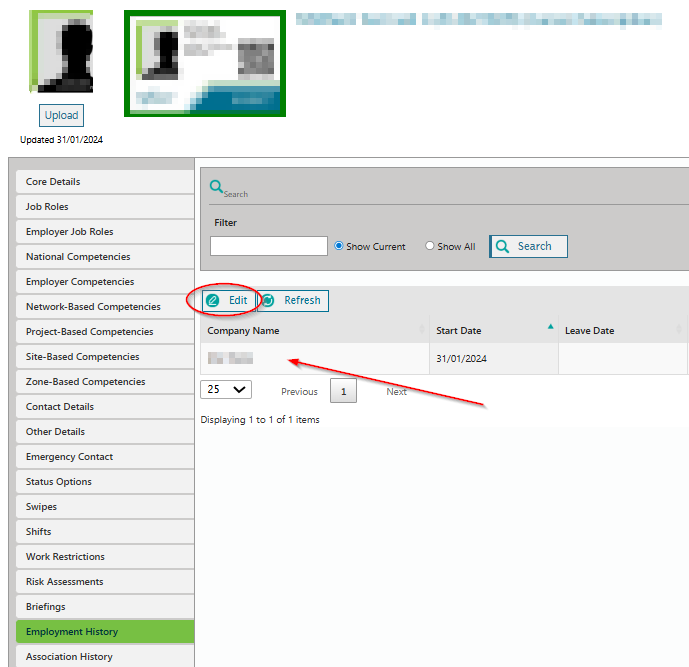 4 | Click on Employment History on the left-hand side menu of the cardholder's profile. Select your organisation and click on Edit. |