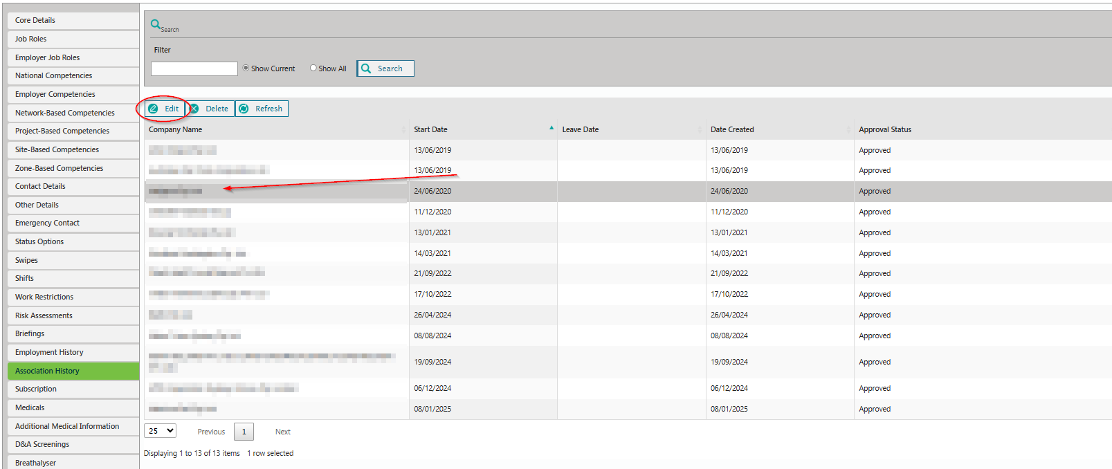Click on the Association History tab on the left-hand side menu and highlight the association details that are to be removed. Click the EDIT button.