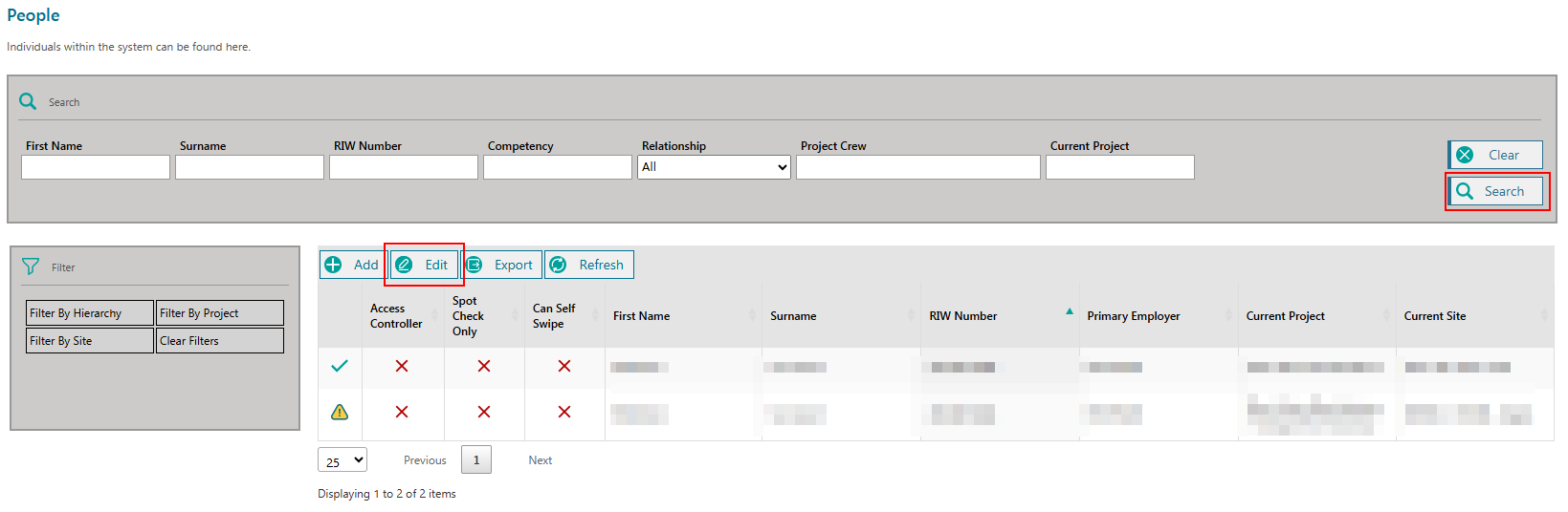 Enter a search field or leave blank to bring up the entire workforce by clicking SEARCH. Select the cardholder by highlighting their name and clicking on the EDIT button.