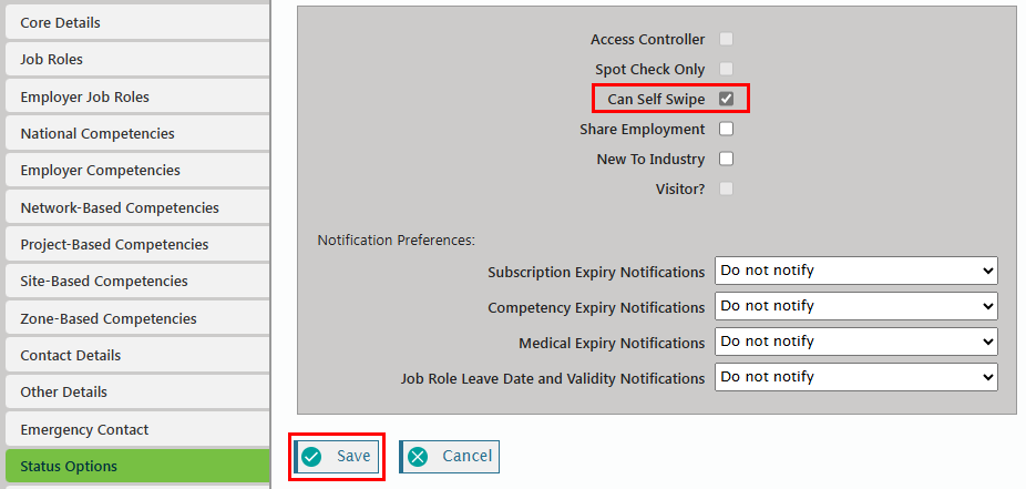 Click on the Status Options tab on the left hand side menu of the cardholders profile. Tick the Can Self Swipe box and then click SAVE.