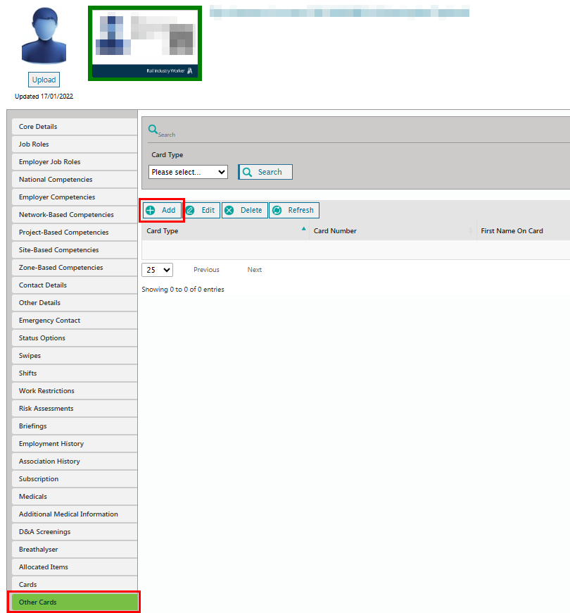 From the left hand tab menu, click on the Other Cards tab to display the following screen. To add a new card, click on the Add button.
