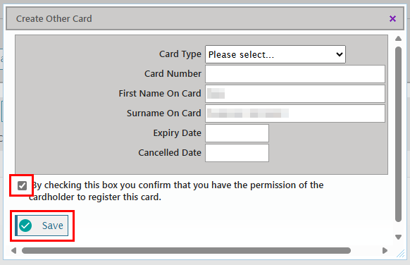 On the Create Other Card pop up, fill in the card type, card number, name on card and expiry date (if known).