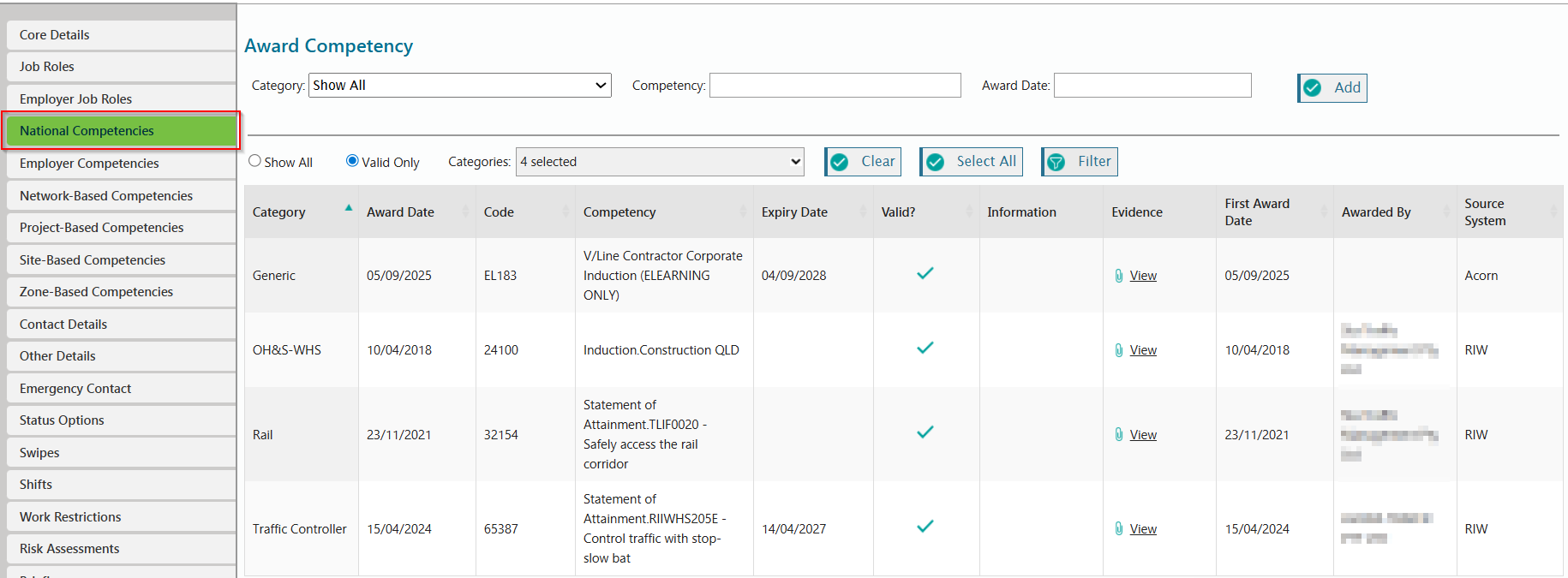 Select either the National, Employer, Network, Project, Site or Zone Competencies tab from the left hand side of the cardholders profile. A list of competencies will display.