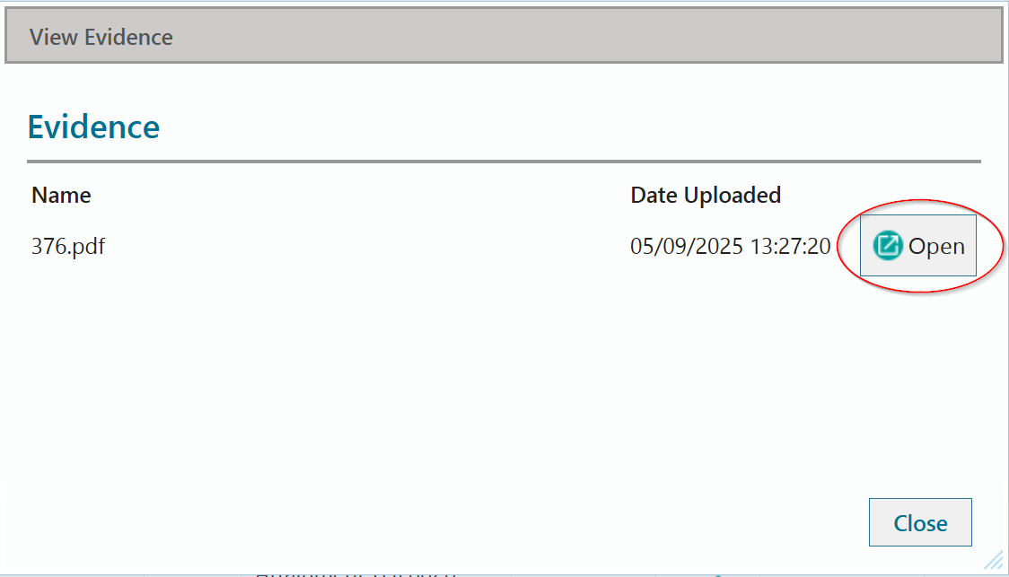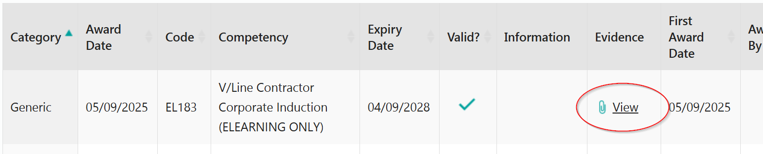 The evidence uploaded against each competency can be accessed by selecting View within the Evidence column.