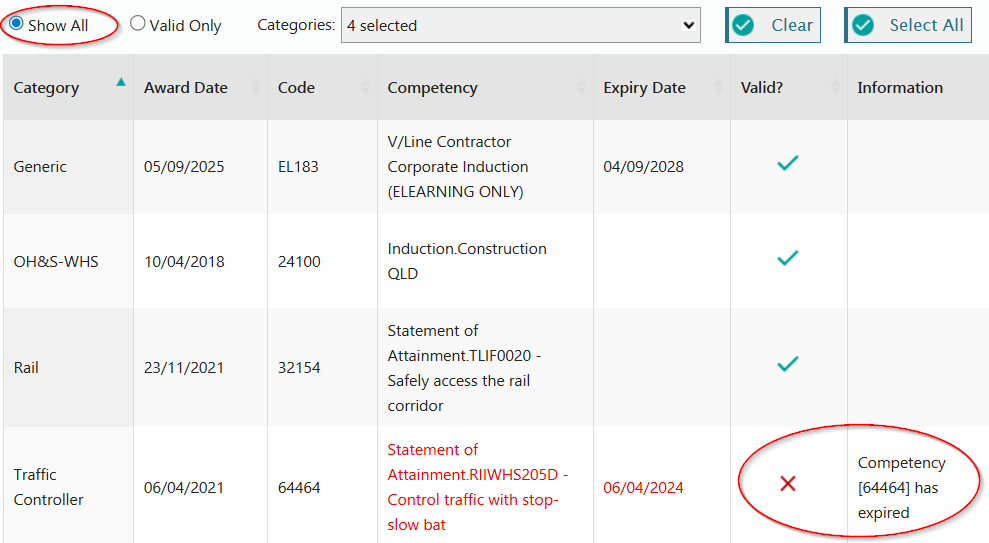 If the view is altered to Show All, you can assess expired or rejected competencies. The information column will provide details as to why the competency is invalid.