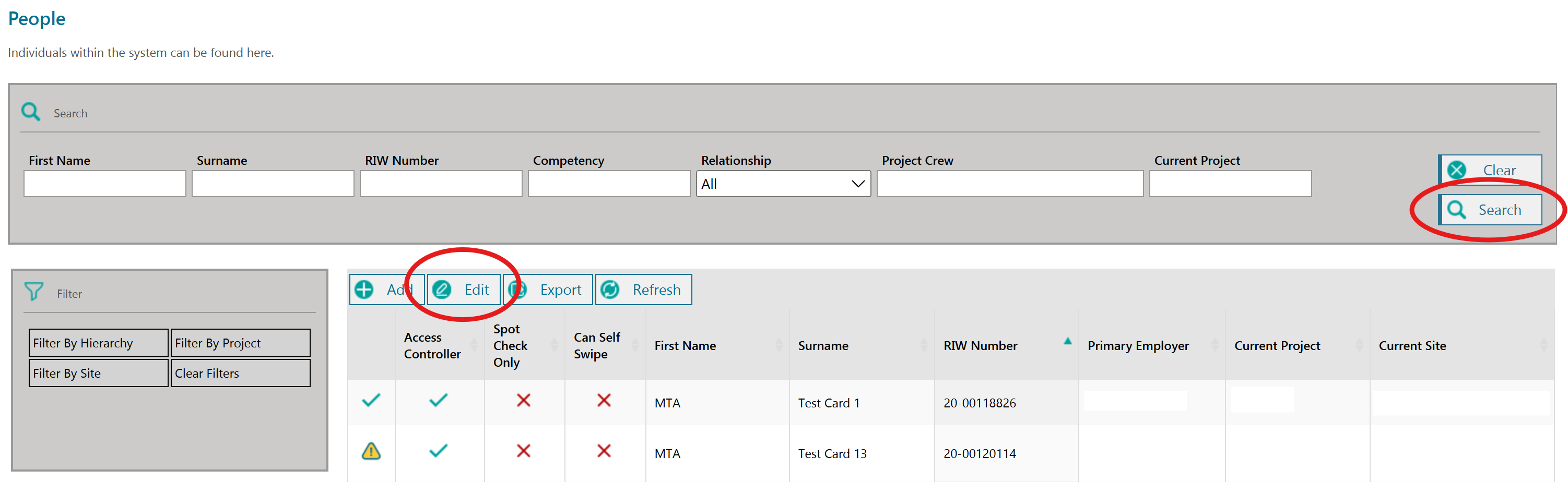 Enter cardholder details into the search field or leave blank and click on search to bring up the workforce. Select the cardholder you wish to allocate a role to by highlighting their name and clicking on the Edit button.