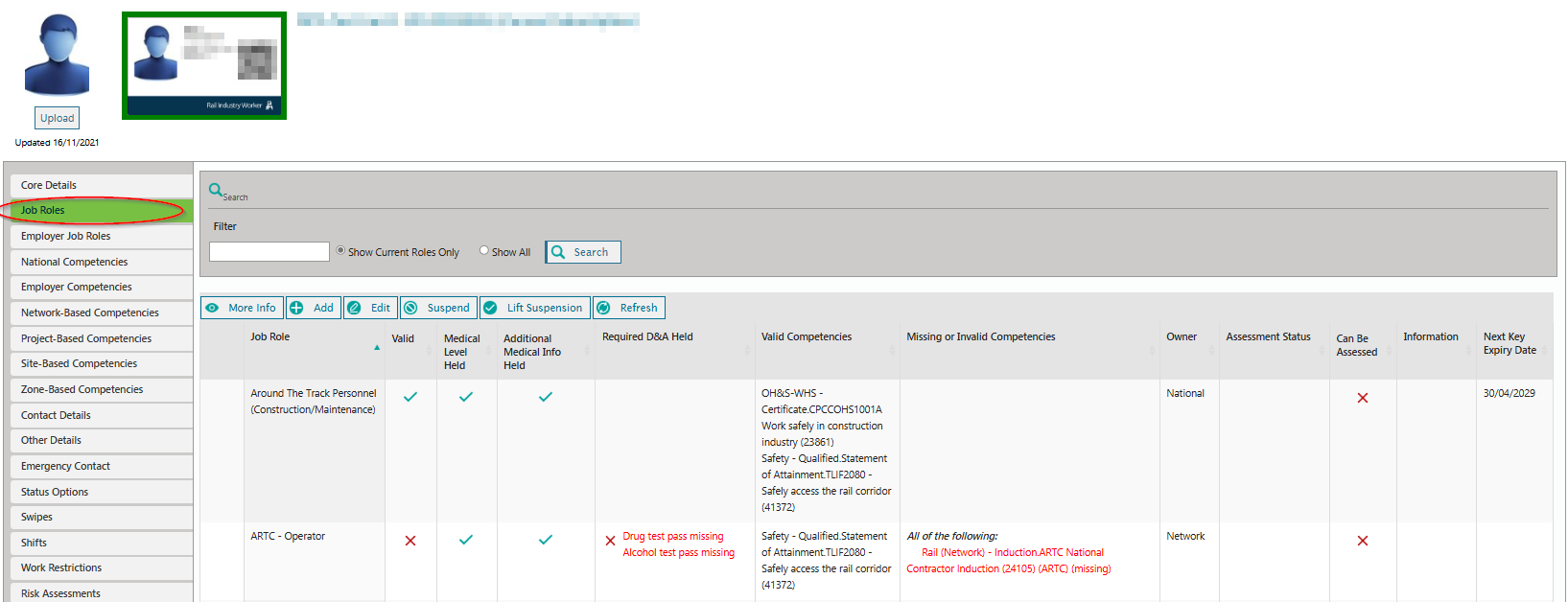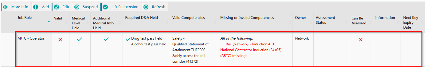 Using the example below, the ARTC - Operator was selected, and it shows the invalid competencies on the right-hand side of the red box.