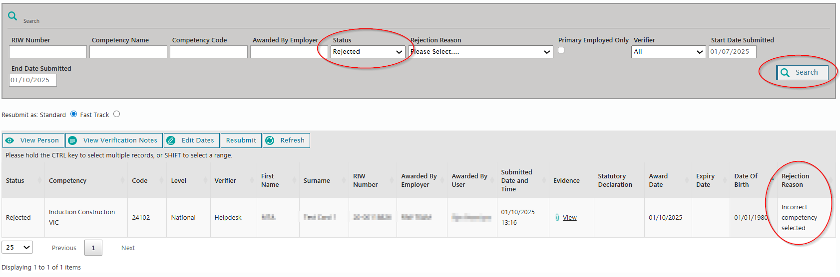 Please note only pending verification and rejected competencies will be displayed.