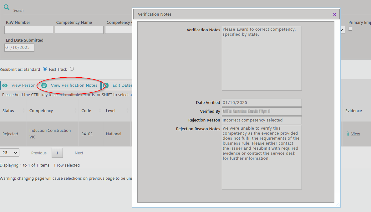 To view more details about the rejection, highlight the record and click on View Verification Notes. A Verification Notes pop-up will appear, detailing the date of rejection, the short rejection reason and rejection reason notes. If the verifier had any additional notes, this is located in the Verification Notes box. This may include additional notes on the rejection and/or instructions on how to rectify the issue.