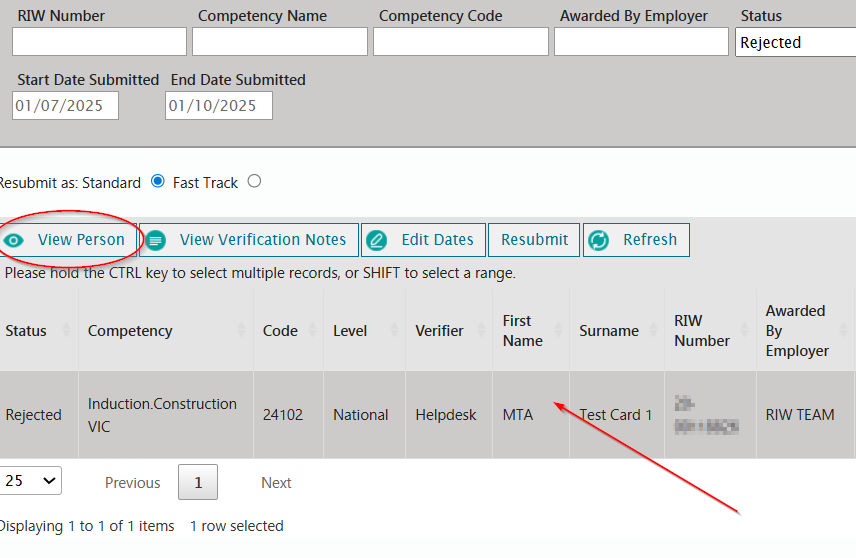 Once the reason for rejection has been determined, select the row and then click on View Person to be taken to the cardholders profile.