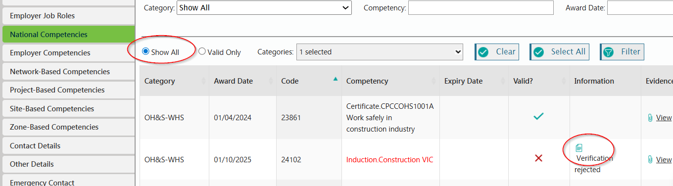 Select the competency type (National, Employer, Network-Based, Project-Based, Site-Based or Zone-based) from the menu on the left. This will bring up the cardholders valid competencies. Select Show All to view the cardholders pending or rejected verifications, which will display in red.