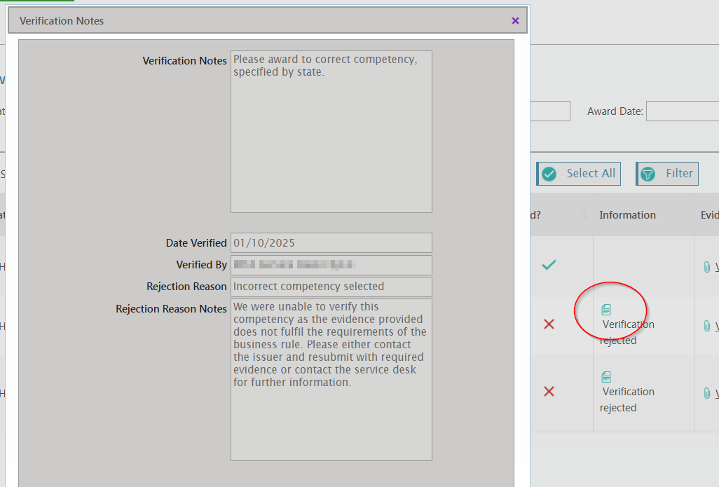 This will display a pop-up with the rejected verification notes. The Verifications Team will provide a reason for the rejection and instructions on how to rectify the issue relating to the competency.