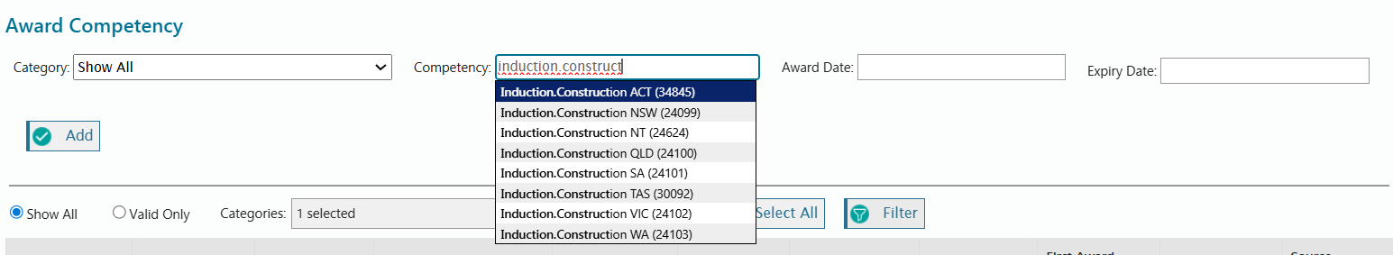Begin typing in the competency field and the name should appear in a drop-down menu. Select the most appropriate competency, enter the Award Date then select Add.