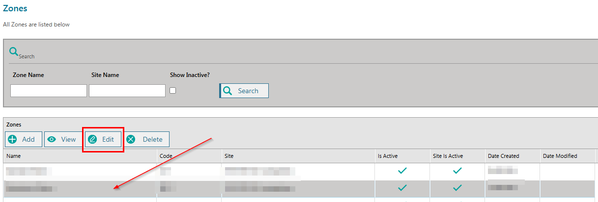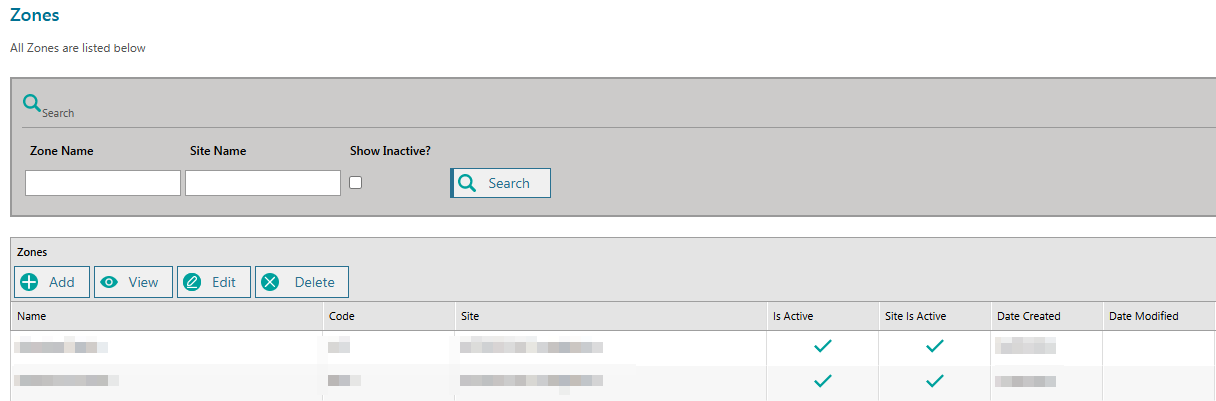 By default, only the active zones will appear. Tick the Show Inactive? box and click the Search button to include inactive zones in the listing.