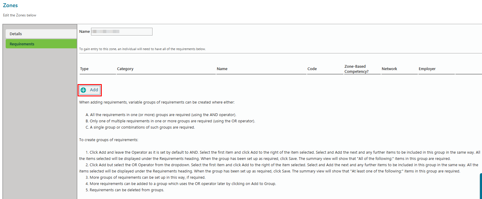 6 | On the Add Entry Rules screen, specify the competency or job roles required for the site. Please note when adding requirements that there are different styles of requirement groupings.