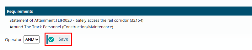 Search for each requirement in the relevant competency or job role field by starting to type in the field. In the example below, we have added a generic MTA induction as a Network-based competency, and the National - Around the Track Personnel job role.