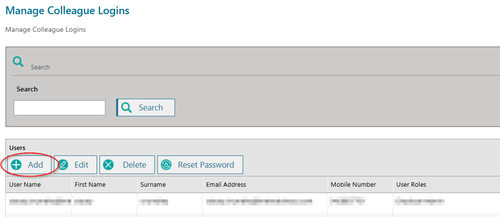 3 | On the Manage Colleague Logins screen, click on the Add button. ![]() |