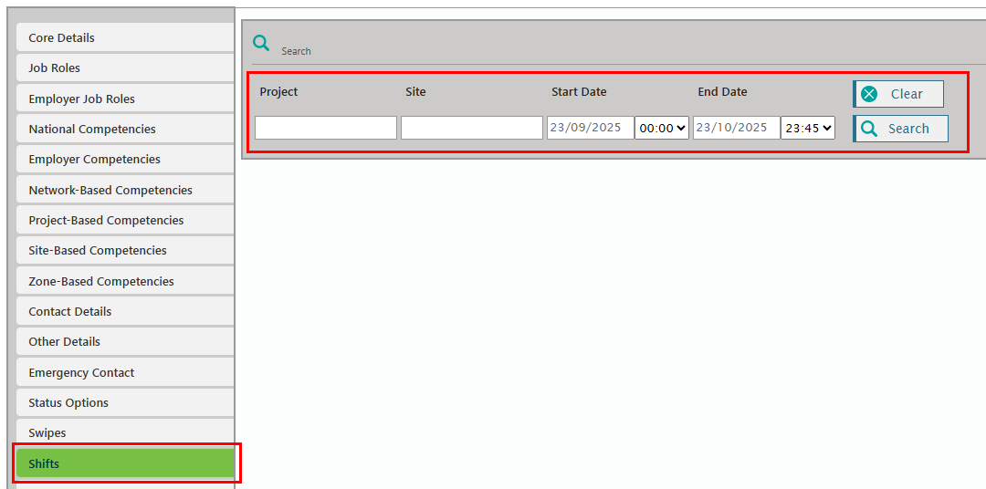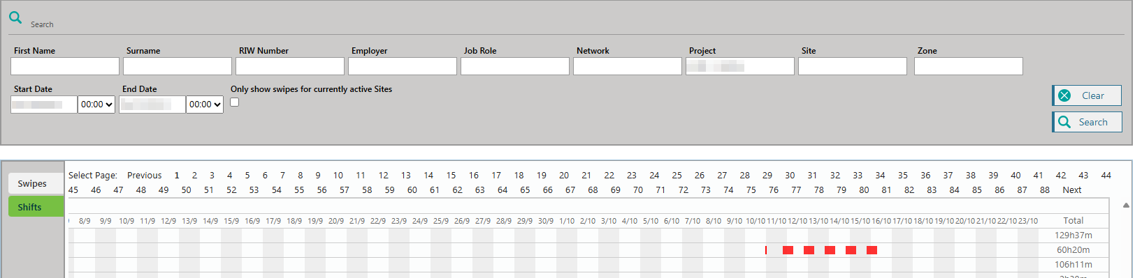 As per above, a project and/or site must be identified before shift data can be displayed. Click Search once the filters have been set.