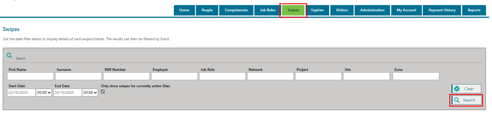 3 | On the Swipes screen, use the search filters to refine the results you want to display. Click Search. You can filter by Rail Industry Worker, Job Role, Project, Site, Zone and Start/End Date and Time. By default, only swipes for active sites will display, but you can deselect this flag if required.