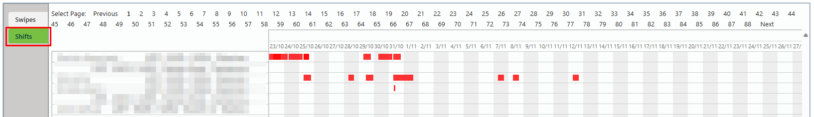 If a wide date range has been selected, use the horizontal scroll bar to view days which are off to the right of the screen. Hover over a shift period (indicated by a red block) to reveal details about the shift.